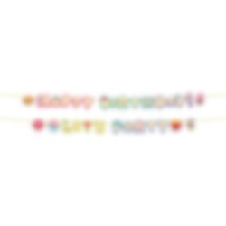 Papirgirlander med teksten Happy Birthday og Let’s Party som setter en leken og fargerik tone på bursdagen. De pastellfargede bokstavene kombineres med søte Kawaii-motiver av godsaker og snacks, noe som gjør girlanderen til en sjarmerende dekorasjon til en barnebursdag i Kawaii-tema.