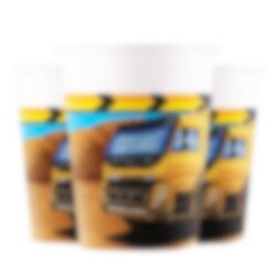 8 stk. pappkopper med fargerike motiver av anleggsbiler. Koppene er 10 cm høye og rommer ca 200 ml.