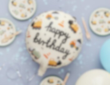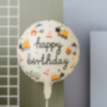 Stilig folieballong med kule kjøretøymotiver. Ballongen har teksten Happy Birthday.