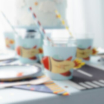 Kreative DIY koppdeksler med flytema. Hver pakke inkluderer seks justerbare pappdeksler. De er perfekte for å dekorere kopper eller drikkeglass og gjøre hver drikke til en del av bursdagens tema. Størrelse: 23 x 9,5 cm.