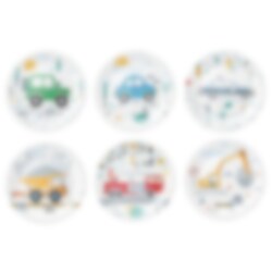 6 stk. pappasjetter med motiv av fargerike kjøretøy, perfekte til en bursdag med kjøretøytema! Asjettene har en diameter på ca 18 cm.