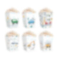 6 stk. popcornbokser med kule kjøretøymotiver, perfekte for å servere popcorn eller annen snacks. Boksene er laget av papp og er 15 x 8,5 cm store.