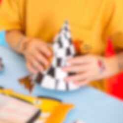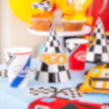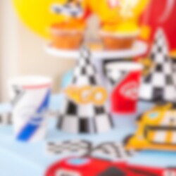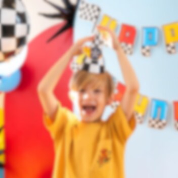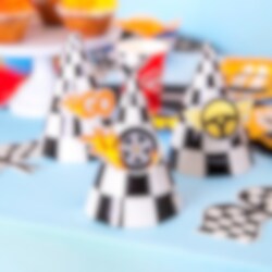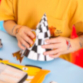 6 stk. festhatter i klassisk rutet racing-mønster, perfekte å ha på når den lille racersjåføren fyller år! Hattene monteres enkelt og dekoreres med medfølgende trykte papirdekorasjoner med racing-tema som festes med limprikker.