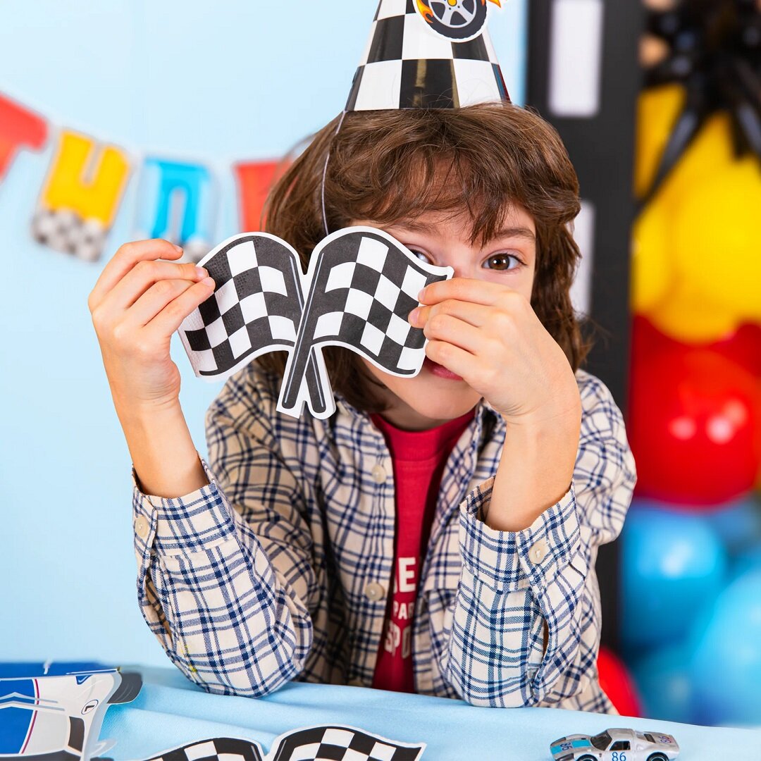 12 stk. servietter formet som en klassisk rutete målflagg i svart og hvitt. Perfekte når du vil skape en helhetlig og fartfylt dekking til bursdagsfesten med Racing Car-tema.