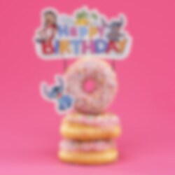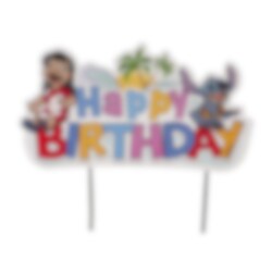 Cake topper av papp med teksten "Happy Birthday" og mange søte motiver fra Lilo & Stitch. Høyde ca 13 cm.