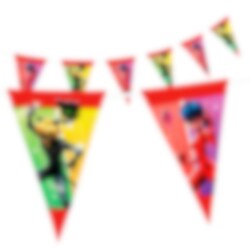 Vakker flaggirlander med motiver fra Miraculous Ladybug. Girlanderen er laget av plast og er 5 meter lang og er en fin dekorasjon til bursdagen din.