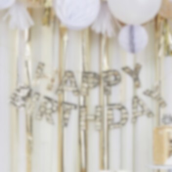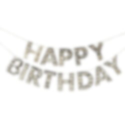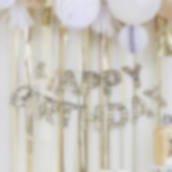 Banner laget i papp i skinnende gull, som avbilder ordene "Happy Birthday" fra kolleksjonen Mix it Up. En imponerende dekorasjon å pynte med til fest. Banneret er ca. 3 meter lang og har frynser som du kan du kan stryke opp for å få en kul effekt.
