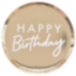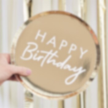 8 stk. gullfolierte papptallerkener fra kolleksjonen Mix it Up med motiv av den hvite teksten "Happy Birthday". Perfekt å dekke med til festen. Tallerkenene er ca. 24 cm i diameter.