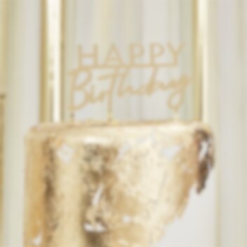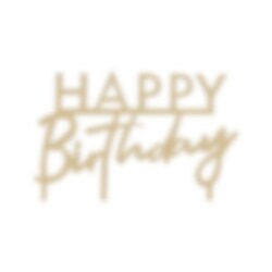 Kakepynt i gull akrylfarge som avbilder ordene "Happy Birthday". Den ultimate dekorasjonen å pynte kaken med. Kakepynten er ca. 10 cm høy.