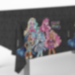 Svart plastduk med kule Monster High-motiver. Duken måler 120 × 180 cm og passer til de fleste bord.