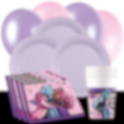 Denne komplette festpakken med i Monster High tema inkluderer lavendelfargede papptallerkener (22,5 cm), Monster High Pappkopper (200 ml) og Monster High servietter (33 x 33 cm) for 8 eller 16 personer, i tillegg medfølger 10 stk. rosa og 10 stk. lyselilla ballonger og en svart plastduk (137 x 274 cm).