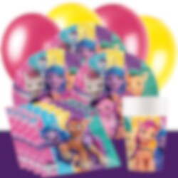 Denne komplette festpakke i My Little Pony tema med originaltilbehør inkluderer tallerkener (23 cm), pappkopper (260 ml) og servietter (33 x 33 cm) til 8 eller 16 personer. Utover dette inneholder pakken også 10 stk. gule og 10 stk. rosa ballonger og en lilla bordduk av plast (137 x 274 cm).