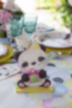 Supersøt borddekorasjon i tre med motiv av en panda som er på bursdagsfest. Dekorasjonen er laget av tre og er 14 x 20 cm stor.