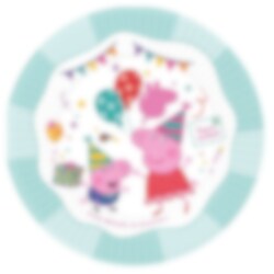 8 stk. papptallerkener med et fargerikt motiv av Peppa Gris og hennes bror George som feirer bursdag. Perfekte for å gjøre borddekkingen ekstra morsom på bursdagen. Tallerkenene har en diameter på 23 cm.