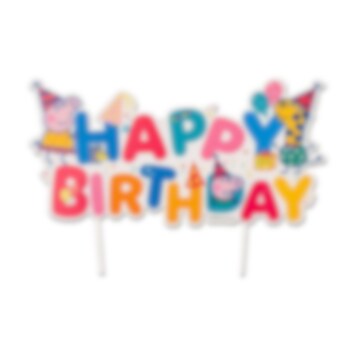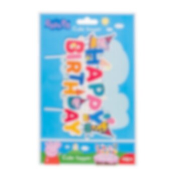 Cake topper av papp med teksten "Happy Birthday" og mange søte motiver fra Peppa Gris. Høyde ca 13 cm.