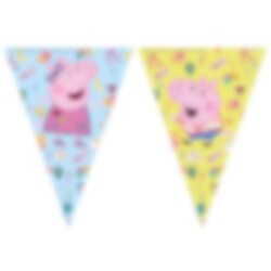 Flaggirlander i gult og blått med pent motiv av Peppa og Georg Gris fra den populære TV-serien Peppa Gris - Peppa Pig. En fin dekorasjon til å pynte festrommet med. Flaggirlanden er laget av plast og er ca. 2,3 meter lang.