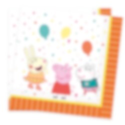 16 stk. servietter med oransje og gule kanter, hvit bakgrunn og med motiv av Peppa Gris og hennes venner Rebecca Rabbit og Suzy Sheep samt fargerike ballonger og konfetti. Serviettene er 2-lags og er ca. 33 x 33 cm store utfoldet.