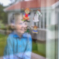La barna slippe løs kreativiteten i vinduet. Med dette morsomme settet kan de male sine egne dekorasjoner med Pippi, Herr Nilsson, Lille Gubben og andre kjente figurer. Motivene males på plastark som følger med og kan deretter festes på vindusflater helt uten lim eller kliss.