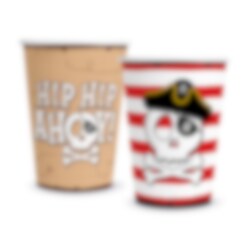 Dekk bordet til en fartsfylt piratbursdag med disse festlige pappkoppene i klassisk pirattema. Koppene har to forskjellige motiver, ett med teksten "Hip Hip Ahoy!" på en bakgrunn som ligner et skattekart og ett med dødningehode, pirathatt og røde striper, noe som gjør dem til en stilig og leken detalj på bursdagsbordet.