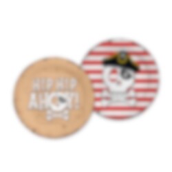 Dekk bordet til en herlig piratbursdag med disse festlige tallerkenene i klassisk pirattema. Tallerkenene har to forskjellige motiver: ett med teksten "Hip Hip Ahoy!" på en bakgrunn som ligner et gammelt skattekart, og ett med dødningehode, pirathatt og røde striper. Dette gir borddekkingen en leken og eventyrlig følelse.