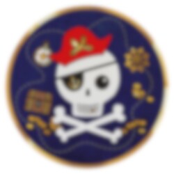 8 stk. stilige papptallerkener med motiver av en Jolly Roger omgitt av piratrelaterte ting i gull. Pynt opp bordet med disse tallerkenene til de små piratene når det er tid for piratfest. Tallerkenene er ca. 22 cm i diameter og er laget av papp.