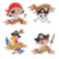 4 stk. ark med klistremerker som har forskjellige kule piratmotiv. Perfekt til å overraske vennene dine med i godteposene, eller hvorfor ikke bruke de som fyll i pinjataen din?