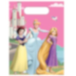 6 stk. godteposer i plast med et vakkert motiv av Disney-prinsessene Snøhvit, Askepott og Rapunzel foran et eventyrlig slott. Perfekte til å fylle med godis og små overraskelser som barna kan ta med seg hjem etter bursdagen med Disney Prinsesser-tema.