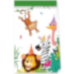 4 stk. godteposer av papir med et fargerikt jungelmotiv der en ape, en sebra, en løve og en struts med partyhatter feirer blant grønne blader og serpentiner. Perfekte til å fylle med godteri, småleker eller overraskelser som barna kan ta med seg hjem etter bursdagen.