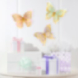 3 stk. virkelig vakre veggdekorasjoner i form av sommerfugler i pastellfarger med gullfolie. Sommerfuglene er laget av papp og har en størrelse på 29 x 24 cm.