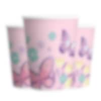 8 stk. papirkopper i en lys rosa farge med hvite kanter og med motiver av vakre sommerfugler blant blomster. Dekk på med disse for å gjøre bordet ekstra fint når det er fest. Koppene er ca 10 cm høye og rommer ca 250 ml.