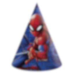 6 stk. festhatter med kule motiver av Spiderman. Hattene er ca 19 cm høye og holdes på plass med et strikk.