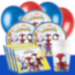 Denne komplette bursdagspakken med Spidey inkluderer tallerkener (23 cm), pappkopper (200 ml) og servietter (33 x 33 cm) for 8, 16 eller 24 personer. I tillegg medfølger 10 stk. røde ballonger og 10 stk. mørkeblå ballonger og en mørkeblå plastduk (137 x 274 cm). Pakken for 24 gjester inkluderer 2 stk. duker.