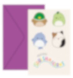 Inviter til en fargerik og koselig bursdag med disse Squishmallows-invitasjonene med sjarmerende illustrasjoner av flere populære Squishmallows-figurer. Perfekte for barn som elsker de myke og søte karakterene. I pakken inngår også seks lilla konvolutter.