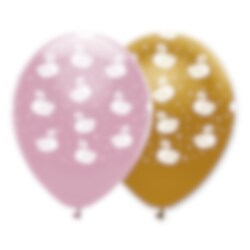 6 st. lateksballonger i rosa og gull og med motiv av vakre svaner. Fine å pynte med til festen med Stylish Swan som tema. Ballongene blir ca 30 cm i diameter oppblåste og kan blåses opp med både vanlig luft og helium.