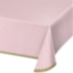 Stor bordduk av plast i rosa med gullfargede kanter og stjerner. Et flott komplement å ha på bordet under festen med Stylish Swan tema. Duken er ca 137 x 259 cm stor.