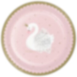 8. stk papptallerkener med motiv av en svane foran en rosa bakgrunn med gullfolierte kanter. Et flott tilbehør å ha med på festbordet med Stylish Swan som tema. Tallerkenene er ca. 22 cm i diameter.