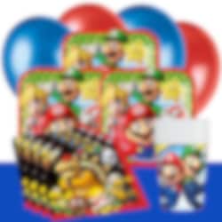 Denne komplette festpakke med Super Mario originaltilbehør inkluderer tallerkener (18 cm), pappkopper (250 ml) og servietter (33 x 33 cm) for 8, 16 eller 24 personer. I tillegg medfølger 10 stk. mørkeblå og 10 stk. røde ballonger og en mørkeblå plastduk (137 x 274 cm). Pakken for 24 gjester inkluderer 2 stk. duker.