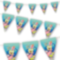 Fargesprakende flaggirlander av papp med magiske motiver fra SvampeBob. En perfekt dekorasjon for å forvandle festlokalet til en fortryllende undervannsverden full av vennskap og glede. Girlanderen er ca. 3 meter lang, og hver vimpel er ca. 24,5 cm høy.