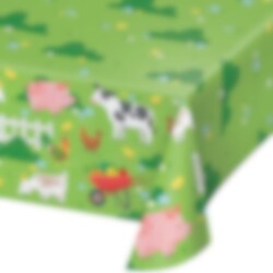 En grønn papirduk med motiver av fine husdyr. Duken er 137 x 259 cm.