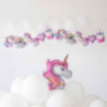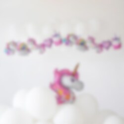 Fin ballonggirlander med motiv av enhjørninger, perfekt til en bursdag med enhjørningstema! Girlanderen er 206 cm lang og hver ballong måler 34 cm. Ballongene har en selvlukkende ventil, og du kan enkelt blåse dem opp med en ballongpumpe eller det medfølgende sugerøret.