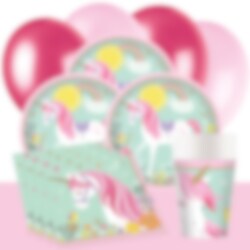 Denne komplette festpakke med flotte enhjørningstilbehør inkluderer tallerkener (23 cm), pappkopper (250 ml) og servietter (33 x 33 cm) for 8, 16 eller 24 personer. I tillegg medfølger 10 stk. lyserosa ballonger og 10 stk. mørkerosa ballonger og en rosa plastduk (137 x 274 cm). Pakken for 24 gjester inkluderer 2 stk. duker.