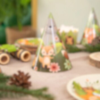 6 stk. festhatter i vakre farger med søte motiver av skogsdyr, perfekte for en bursdag med skogstema.