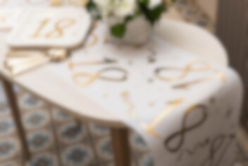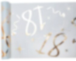Hvit bordløper med dekorative mønstre og tallet 18 i gullfolie. Denne bordløperen kommer i en praktisk rull og den er 30 cm bred og hele 5 meter lang. Det strekker seg til flere bord og en stor fest. Materialet er 100 % polyester.