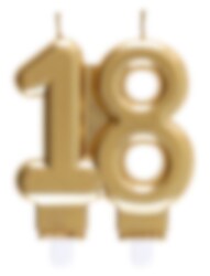 Kakelys i gull elegant format som tallet 18. Kakelyset har en størrelse på 7,5 x 9 cm.