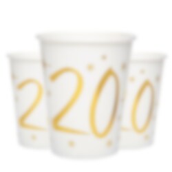 10 stk. hvite pappkopper med dekorative stjerner og tallet 20 i gullfolie. Disse koppene er virkelig vakre og et perfekt innslag til 20-årsfestens dekking. Koppene er 10 cm høye og rommer 270 ml.