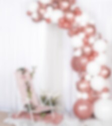 Vakker ballongbue i rosegull og hvite toner, som du bygger selv. En virkelig imponerende dekorasjon som passer til fester, selskap eller bryllup. Pakken inneholder hele 84 stk. ballonger i forskjellige størrelser og tilbehør. Ballongbuen er ca. 5 meter lang.
