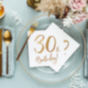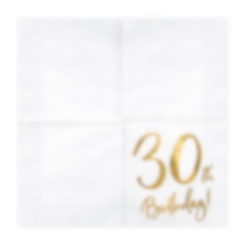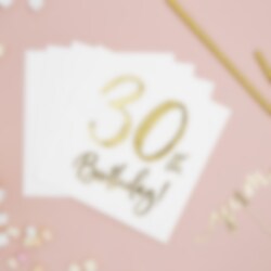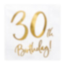 20 stk. servietter i hvitt med gullmetallisk trykk hvor det står "30th Birthday!". Perfekte å pynte med til en 30-årsfest. Serviettene er i standardstørrelse, ca. 33 x 33 cm brettet ut.