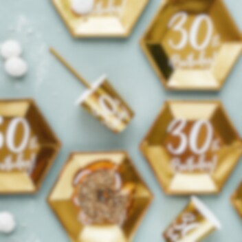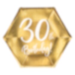 6 stk. gull papptallerkener med teksten "30th Birthday!" i hvitt. Perfekt til å dekke bordet med til 30-årsfesten. Tallerkenene er ca. 20 cm store.