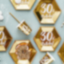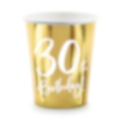 6 stk. pappkopper i flott gullmetall farge og med teksten "30th Birthday!" med hvitt trykk. Perfekt til å dekorere bordet med til 30-årsfesten. Koppene rommer ca. 2,2 dl.