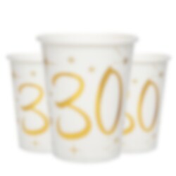 10 stk. hvite pappkopper med dekorative stjerner og tallet 30 i gullfolie. Disse koppene er virkelig vakre og et perfekt innslag til 30-årsfestens dekking. Koppene er 10 cm høye og rommer 270 ml.